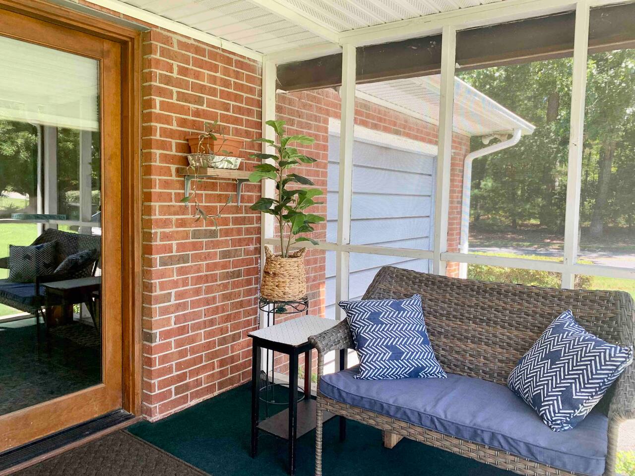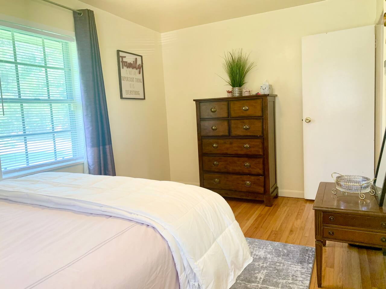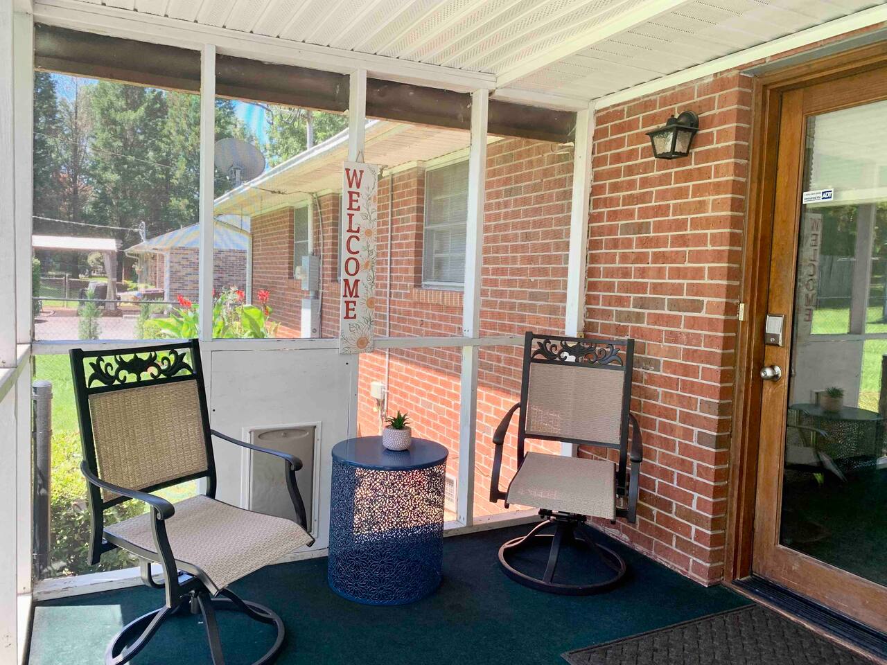 A brick ranch home located on a corner lot in a lovely neighborhood with 4 beds. Cleaning fee guarantees: all surfaces are sanitized & all linens are washed between guests Luggage Drop-off: unable to accommodate at this time TV SERVICES - No cable. Smart TV streaming services only (guests must use personal login credentials) ENTIRE HOME: 1 level PRIMARY BEDROOM: Queen bed, ceiling fan, room darkening curtains PRIMARY BATHROOM: Walk-in shower, towels, hair dryer, soap, shampoo, conditioner SECOND BEDROOM: Full bed, room darkening curtains THIRD BEDROOM: Two Twins (trundle pull-out), room darkening curtains LIVING ROOM: sofa, 2 sitting chairs, FireTV with streaming apps, 2 sitting chairs, ceiling fan DINING BEDROOM: 6 table and chairs, family games (in buffet) KITCHEN: fridge, microwave, drip coffee, ground coffee/tea, silverware, wine glasses, mugs, cups and plates (Qty 8 each), children's dinnerware, knives, pots/pans, skillets, baking dishes/sheets, mixing bowls, dish sponge/towel, oven mitt, salt, pepper, dishwasher, dish detergent, paper towels --- (starter quantities are provided only. It is the guests' responsibility to provide these items once they have run out) HALLWAY BATHROOM: Shower/tub, towels, hair dryer, soap, shampoo, conditioner BACK PORCH: Screened-in where you can relax, enjoy clean southern air, a beverage, or even chat with friends and fam PARKING: Backyard, on-site parking for 3 vehicles and hitched trailers WASHER & DRYER: clothes detergent (starter quantity) PETS - we are happy to host one (1) hypoallergenic dog 50lbs or smaller for a $80 pet fee (no other animal species, puppies, or incontinent dogs). Guests with unauthorized pets will be asked to leave with no refund. If your dog is a barker and causes disturbance to neighbors, you will be asked to end your stay. Dog must be up-to-date on vaccinations & flea/tick treatments, potty trained for outdoors (no puppy pads allowed) . Must stay off furniture and be leashed outdoors. Must not be left unattended (if left alone, must be crated). Owners will bag and dispose of poop inside & outside of fence.