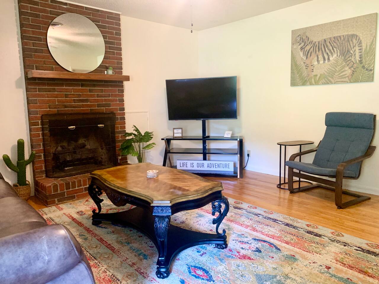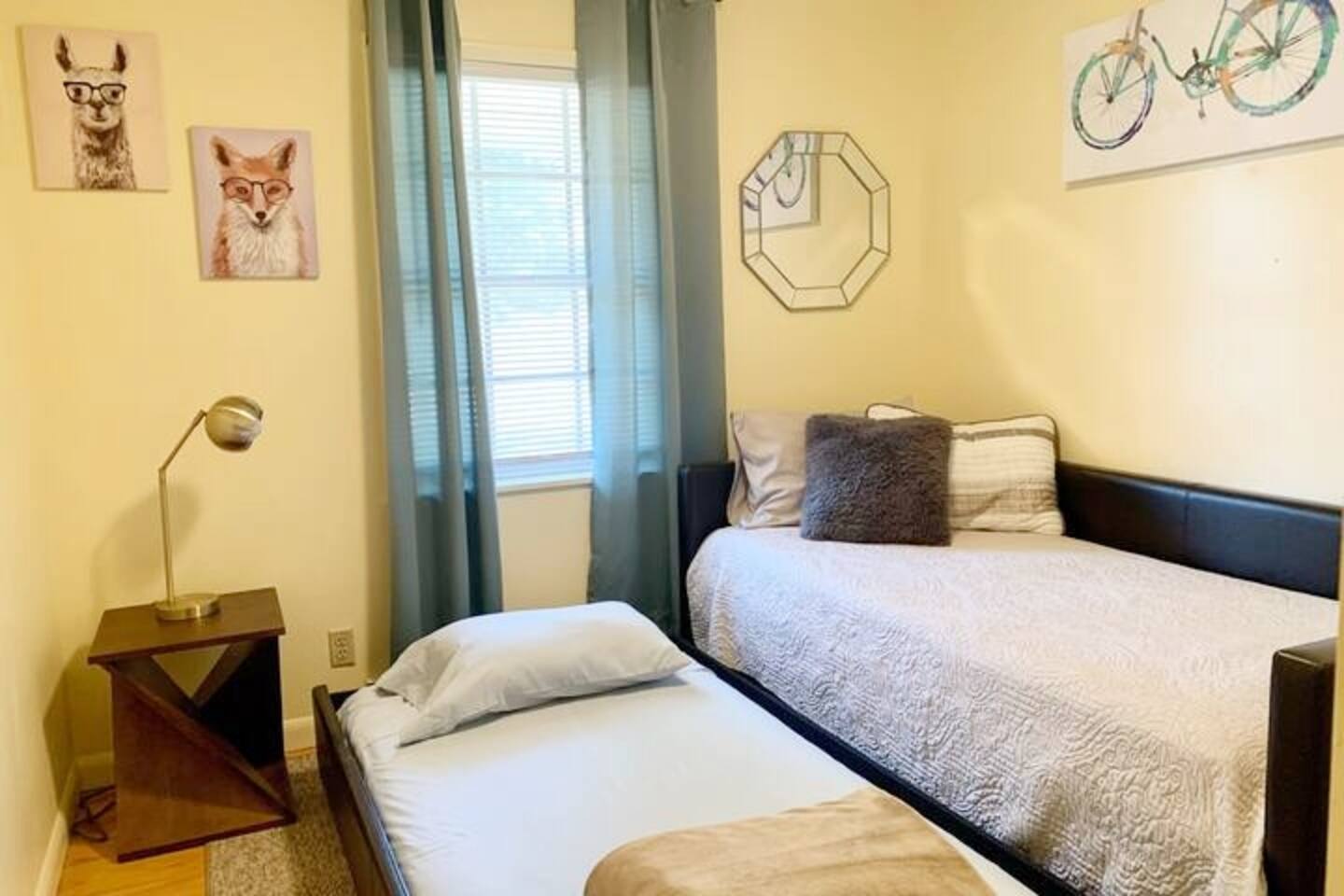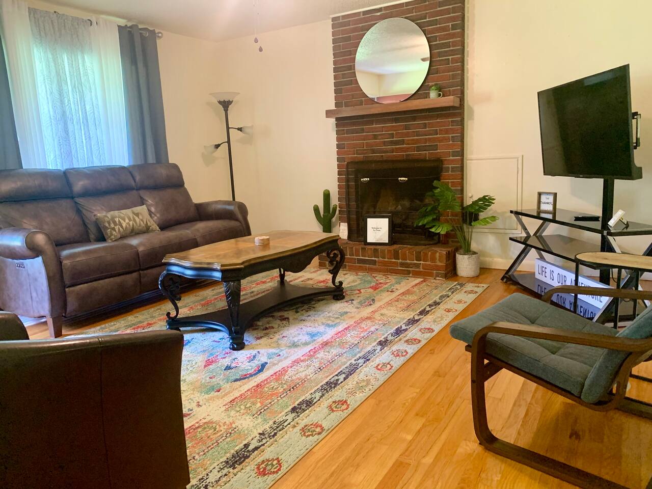 A brick ranch home located on a corner lot in a lovely neighborhood with 4 beds. Cleaning fee guarantees: all surfaces are sanitized & all linens are washed between guests Luggage Drop-off: unable to accommodate at this time TV SERVICES - No cable. Smart TV streaming services only (guests must use personal login credentials) ENTIRE HOME: 1 level PRIMARY BEDROOM: Queen bed, ceiling fan, room darkening curtains PRIMARY BATHROOM: Walk-in shower, towels, hair dryer, soap, shampoo, conditioner SECOND BEDROOM: Full bed, room darkening curtains THIRD BEDROOM: Two Twins (trundle pull-out), room darkening curtains LIVING ROOM: sofa, 2 sitting chairs, FireTV with streaming apps, 2 sitting chairs, ceiling fan DINING BEDROOM: 6 table and chairs, family games (in buffet) KITCHEN: fridge, microwave, drip coffee, ground coffee/tea, silverware, wine glasses, mugs, cups and plates (Qty 8 each), children's dinnerware, knives, pots/pans, skillets, baking dishes/sheets, mixing bowls, dish sponge/towel, oven mitt, salt, pepper, dishwasher, dish detergent, paper towels --- (starter quantities are provided only. It is the guests' responsibility to provide these items once they have run out) HALLWAY BATHROOM: Shower/tub, towels, hair dryer, soap, shampoo, conditioner BACK PORCH: Screened-in where you can relax, enjoy clean southern air, a beverage, or even chat with friends and fam PARKING: Backyard, on-site parking for 3 vehicles and hitched trailers WASHER & DRYER: clothes detergent (starter quantity) PETS - we are happy to host one (1) hypoallergenic dog 50lbs or smaller for a $80 pet fee (no other animal species, puppies, or incontinent dogs). Guests with unauthorized pets will be asked to leave with no refund. If your dog is a barker and causes disturbance to neighbors, you will be asked to end your stay. Dog must be up-to-date on vaccinations & flea/tick treatments, potty trained for outdoors (no puppy pads allowed) . Must stay off furniture and be leashed outdoors. Must not be left unattended (if left alone, must be crated). Owners will bag and dispose of poop inside & outside of fence.